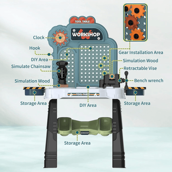 Enhance Skills: Kids Workbench Pretend Play Set encourages recognition and use of various tools, boosting motor skills, coordination, and imagination.