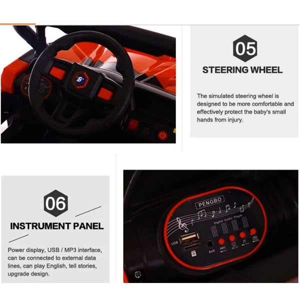 - Ride on jeep has Hi-Fi Dashboard which Includes Start Button, Music System (Compatible with Aux, Pen drive), Swing Option