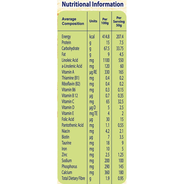 Ingredients: Wheat Flour (52%), Skimmed Milk Powder (27%), Mixed Vegetable Oil (Palm Olein ,Rapeseed Oil, Coconut Oil, Sunflower Oil), Sugar, Date Flakes (3%), Honey Powder (2%), Minerals (Calcium Carbonate, Disodium Hydrogen Phosphate, Ferrous Fumarate, Zinc Sulfate, Potassium Iodide), Vitamins (Vitamin C, Vitamin E, Nicotinamide, Pantothenic Acid, Vitamin B1, Vitamin A, Vitamin B6, Vitamin B2, Folic Acid, Vitamin D3, Biotin, Vitamin B12), Fish Oil Powder, Taurine, Nature Identical Vanilla Flavour, Bifidobacterium lactis Culture. May Contain Soya
