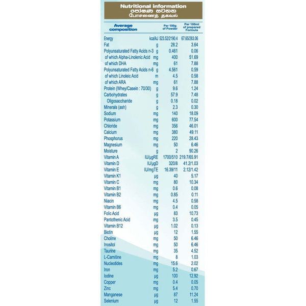 Ingredients – Lactose, Demineralized Whey Powder, High Oleic Sunflower Oil, Skimmed Milk Powder, Coconut Oil, Low Erucic Rapeseed Oil, Sunflower Oil, Minerals (Calcium Citrate, Potassium Chloride, Potassium Citrate, Magnesium Citrate, Sodium Hydrogen Phosphate, Potassium Hydrogen Phosphate, Ferrous Sulfate, Zinc Sulfate, Copper Sulfate, Sodium Citrate, Manganese Sulfate, Potassium Iodide, Sodium Selenate), Soya Lecithin, Fish Oil Rich in DHA, Oligosaccharide, Vegetable Oil Rich in ARA, L-Phenylalanine, Vitamins (Vitamin C, Vitamin E, Nicotinamide, Vitamin B5, Thiamine, Vitamin A, Vitamin B6, Riboflavin, Folic Acid, Vitamin K1, Biotin, Vitamin D3, Vitamin B12), Taurine, Nucleotides, Inositol, L-Histidine, L-Carnitine, Probiotic Culture (Bifidobacterium lactis)