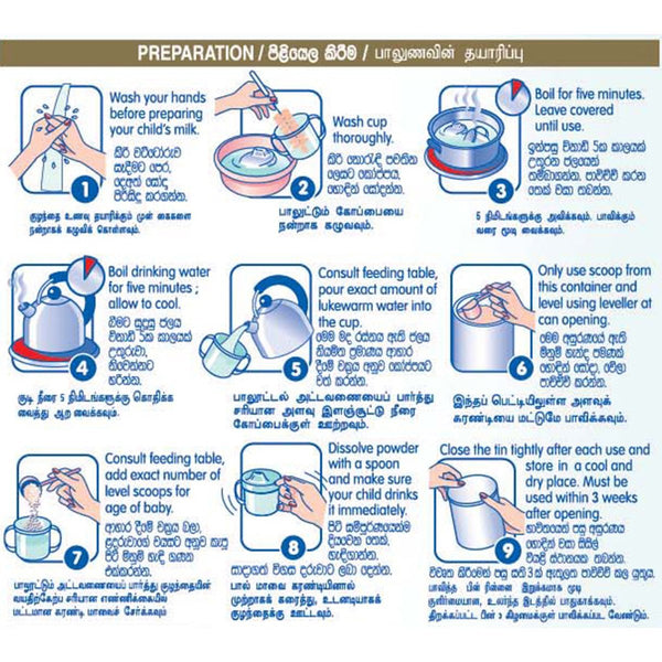 Ingredients - Skimmed Milk Powder, Lactose, Low Erucic Rapeseed Oil, Demineralized Whey Powder, High Oleic Sunflower Oil, Sunflower Oil, Minerals (Calcium Citrate, Sodium Citrate, Potassium Citrate, Disodium Hydrogen Phosphate, Magnesium Citrate, Potassium Chloride, Ferrous Sulfate, Zinc Sulfate, Copper Sulfate, Manganese Sulfate, Sodium Selenate), Soya Lecithin, Oligosaccharide, Vitamins (Vitamin C, Vitamin E, Nicotinamide, Vitamin B5, Thiamine, Vitamin A, Vitamin B6, Riboflavin, Folic Acid, Vitamin K1, Biotin, Vitamin D3, Vitamin B12), Fish Oil Rich in DHA, Vegetable Oil Rich in ARA, Probiotic Culture (Bifidobacterium lactis)