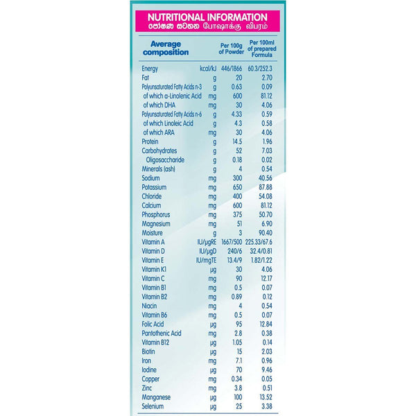 Ingredients - Skimmed Milk Powder, Lactose, Low Erucic Rapeseed Oil, Demineralized Whey Powder, High Oleic Sunflower Oil, Sunflower Oil, Minerals (Calcium Citrate, Sodium Citrate, Potassium Citrate, Potassium Chloride, Disodium Hydrogen Phosphate, Magnesium Citrate, Ferrous Sulfate, Zinc Sulfate, Copper Sulfate, Manganese Sulfate, Sodium Selenate), Soya Lecithin, Oligosaccharide, Nature Identical Vanilla Flavour, Vitamins (Vitamin C, Vitamin E, Nicotinamide, Vitamin B5, Thiamine, Vitamin A, Vitamin B6, Riboflavin, Folic Acid, Vitamin K1, Biotin, Vitamin D3 ,Vitamin B12), Fish Oil Rich in DHA, Vegetable Oil Rich in ARA, Probiotic Culture (Bifidobacterium lactis)